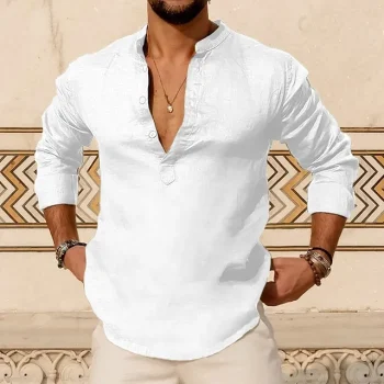 Men’s Linen Shirt Shirt Popover Shirt Summer Shirt Beach Shirt Black White Yellow Long Sleeve Solid Color Henley Summer Spring Hawaiian Holiday Clothing Apparel Button-Down