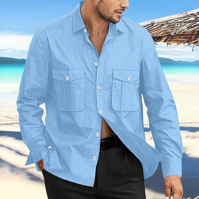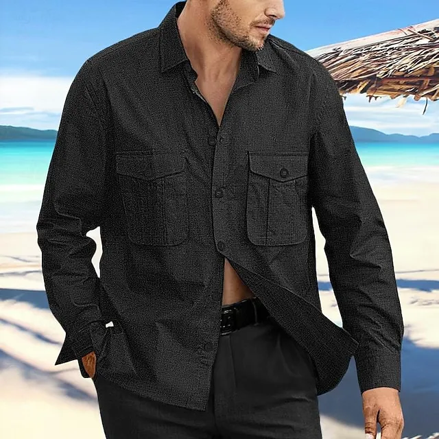 Men’s Linen Shirt Shirt Button Up Shirt Beach Shirt Black Navy Blue Blue Long Sleeve Plain Lapel Spring & Summer Daily Hawaiian Clothing Apparel Pocket