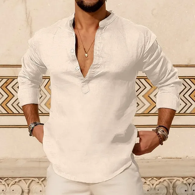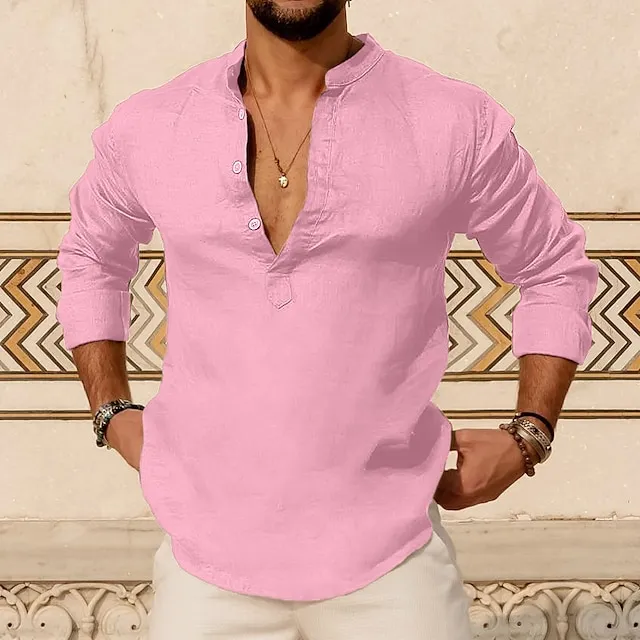 Men’s Linen Shirt Shirt Popover Shirt Casual Shirt Summer Shirt Black White Pink Blue Green Long Sleeve Plain Henley Daily Vacation Clothing Apparel Fashion Casual Comfortable