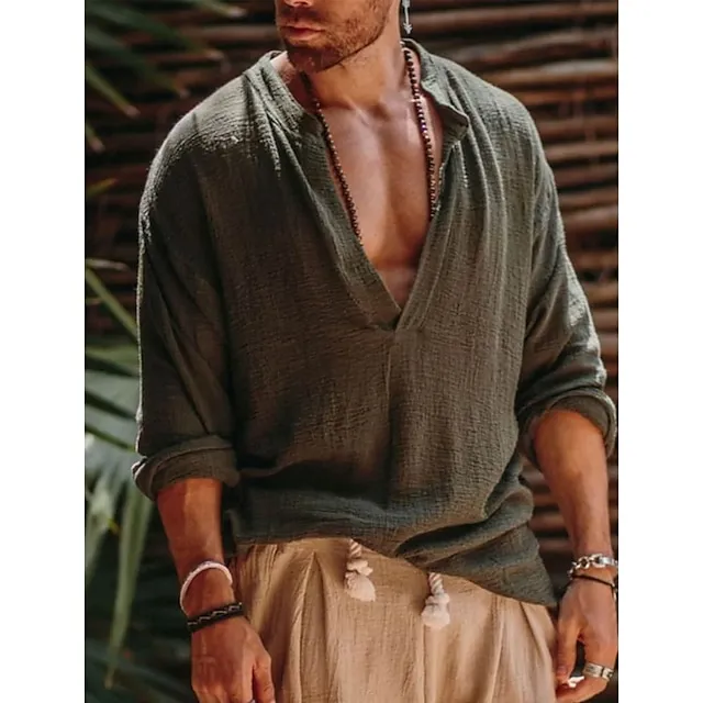 Men’s Linen Shirt Shirt Summer Shirt Beach Shirt Green Beige Long Sleeve Solid Color V Neck Summer Spring Outdoor Street Clothing Apparel
