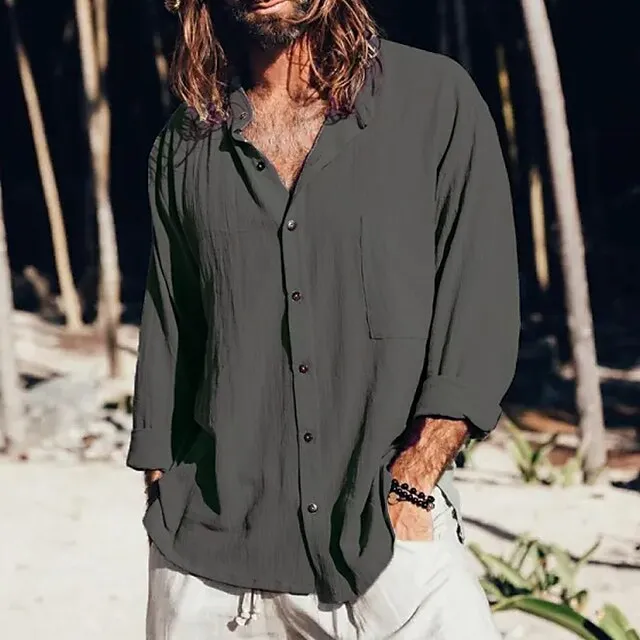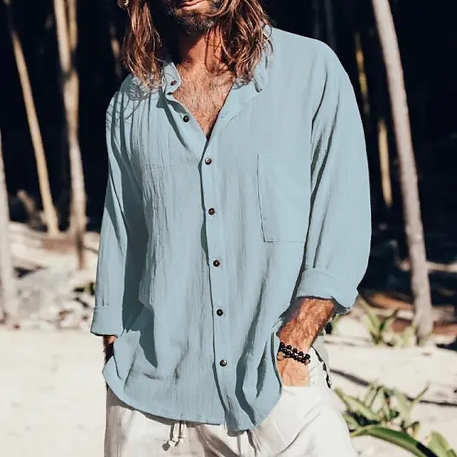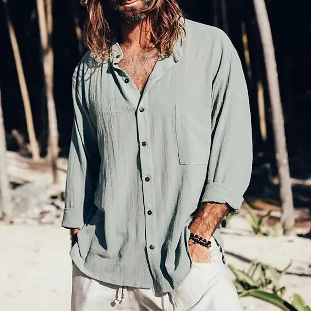 Men’s Linen Shirt Summer Shirt Beach Shirt Black White Blue Long Sleeve Plain Collar Summer Casual Daily Clothing Apparel Front Pocket