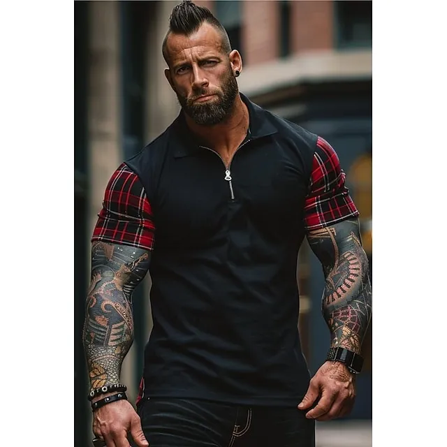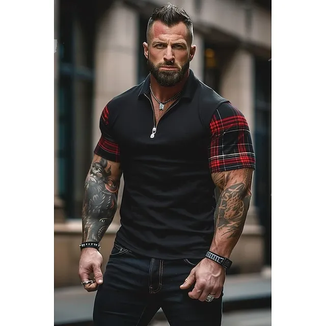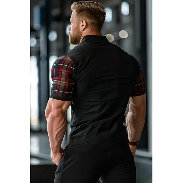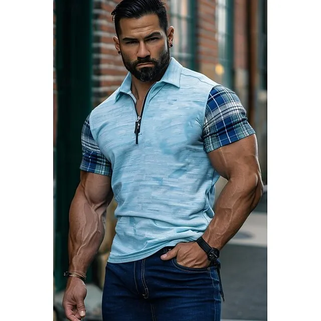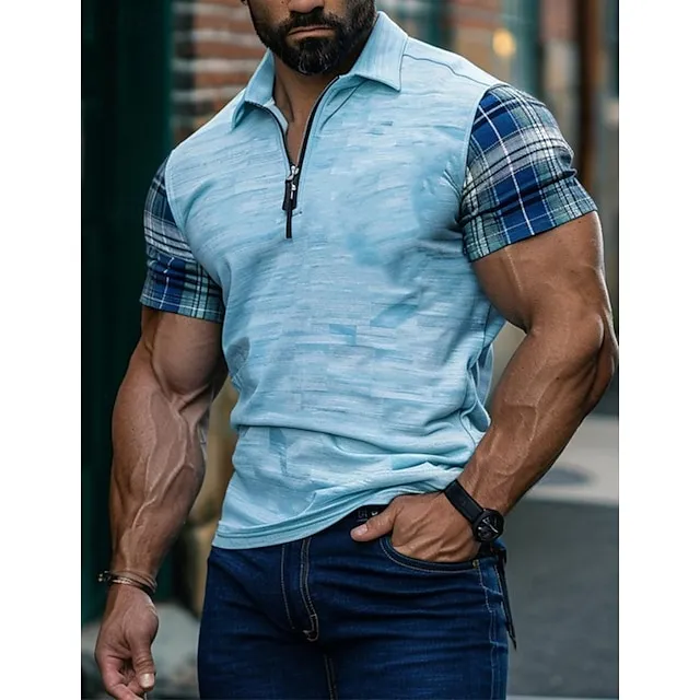 Men’s Polo Shirt Zip Polo Outdoor Sports Quarter Zip Short Sleeve Fashion Modern Plaid Color Block Zipper Splice Summer Regular Fit Black Blue Polo Shirt