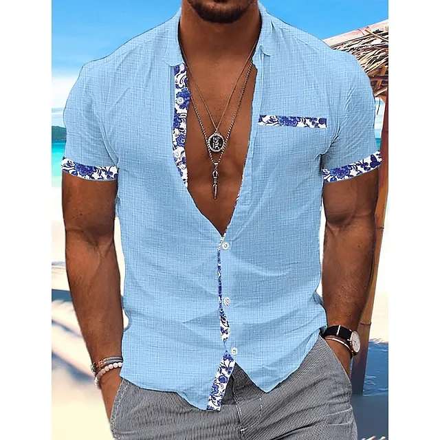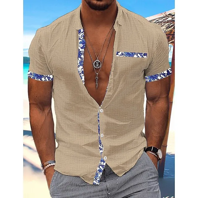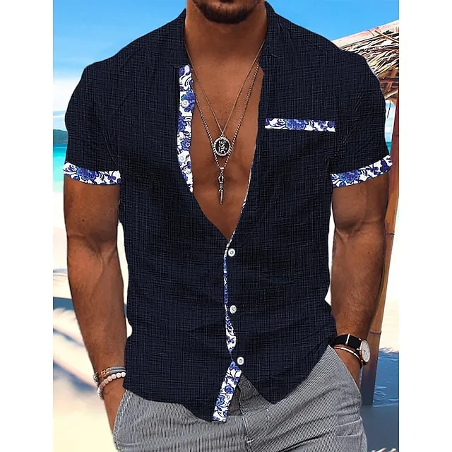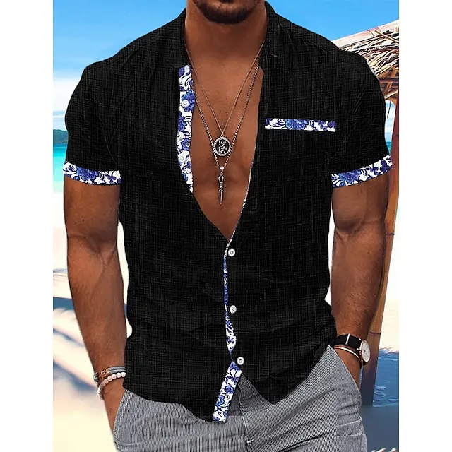 Men’s Shirt Linen Shirt Button Up Shirt Summer Shirt Beach Shirt Black White Pink Short Sleeve Floral Lapel Summer Casual Daily Clothing Apparel Front Pocket
