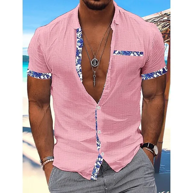 Men's Shirt Linen Shirt Button Up Shirt Summer Shirt Beach Shirt Black White Pink Short Sleeve Floral Lapel Summer Casual Daily Clothing Apparel Front Pocket