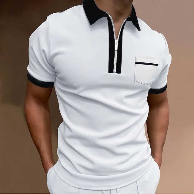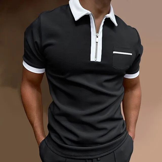 Men’s Zip Polo Polo Shirt Gym golf shirts Turndown Quarter Zip Short Sleeve Sports Designer Solid Colored Patchwork Quarter Zip Spring & Summer Slim Wine Black / Red Black-White Black / Gray White
