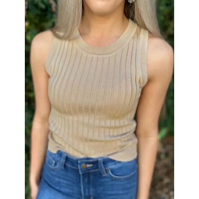 Tank Women's Khaki Solid Color Knitted Street Daily Fashion Round Neck Ribbed S