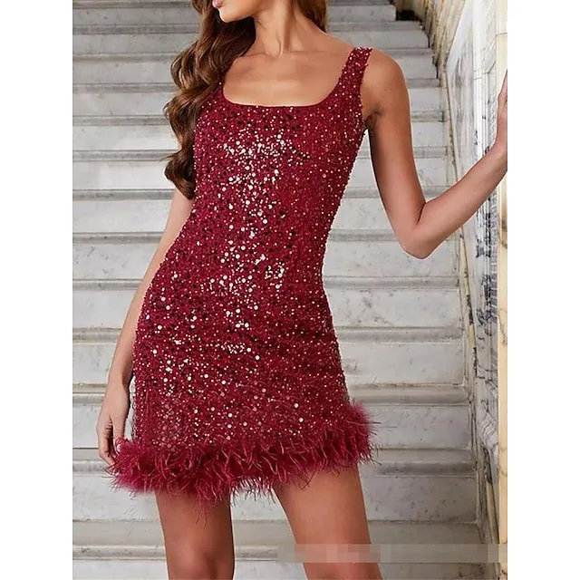 Women’s Sequin Dress Party Dress Feather Dress Mini Dress Wine Sleeveless Plain Sequins Summer Spring Fall Square Neck Party Wedding Guest Birthday Vacation S M L XL