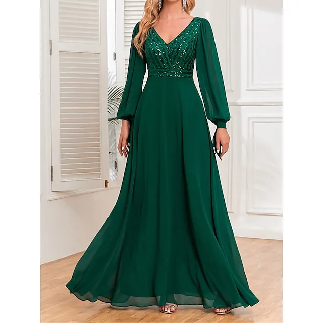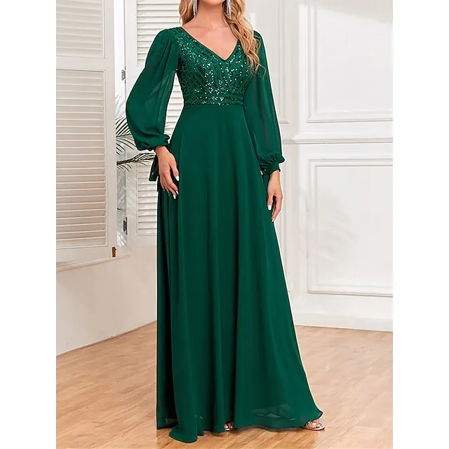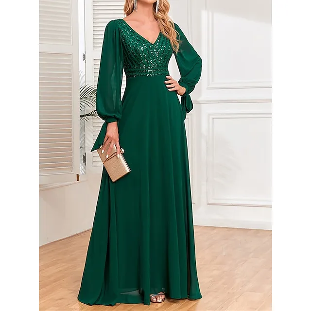 Women’s Sequin Dress Prom Dress Party Dress Sparkly Dress Long Dress Maxi Dress Green Long Sleeve Fall Winter V Neck Fashion Evening Party
