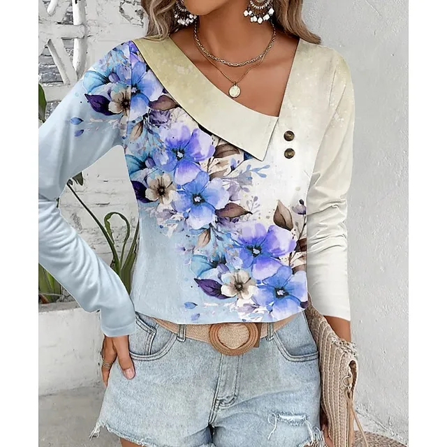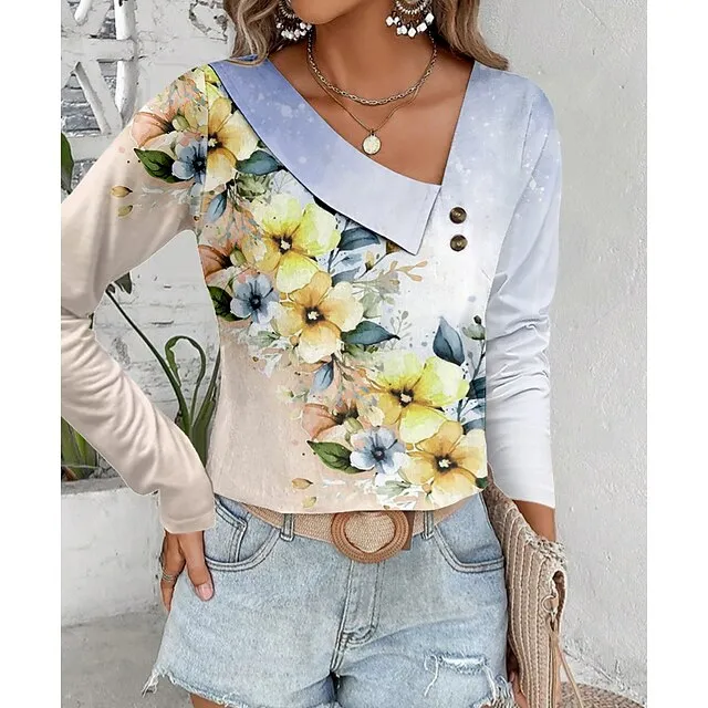 Women’s Shirt Blouse Floral Casual Holiday Yellow Pink Blue Print Long Sleeve Fashion V Neck Regular Fit Spring & Fall