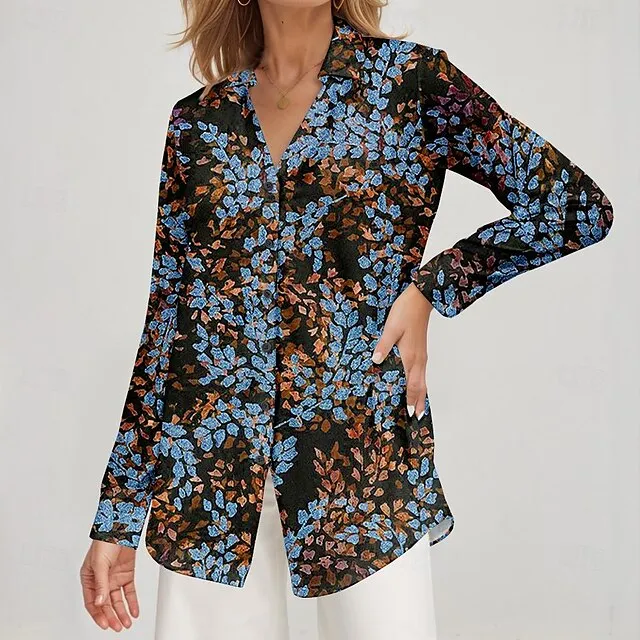 Women’s Shirt Blouse Leaf Casual Pink Blue Khaki Print Button Long Sleeve Fashion V Neck Regular Fit Spring & Fall