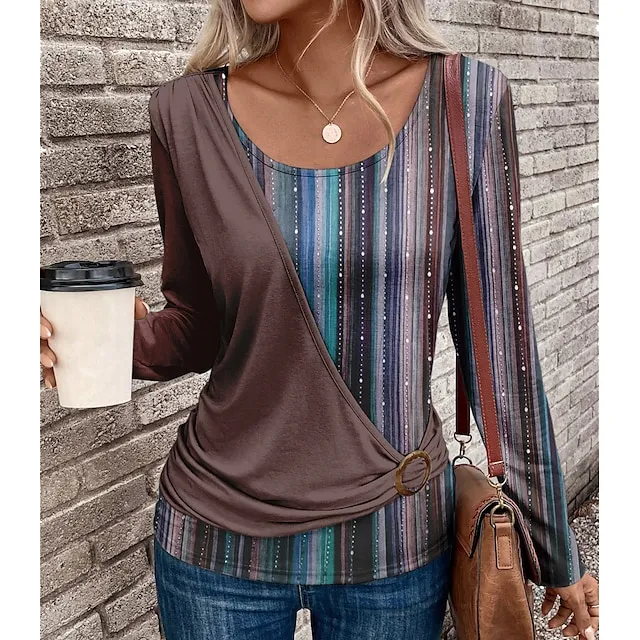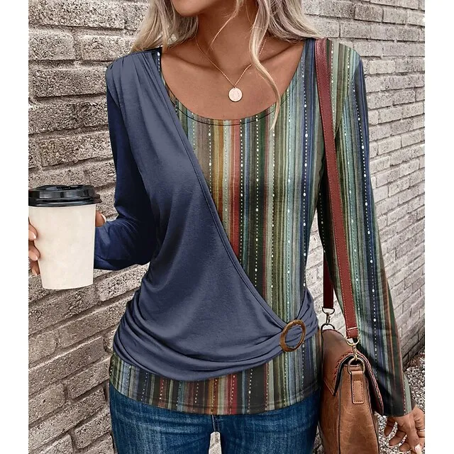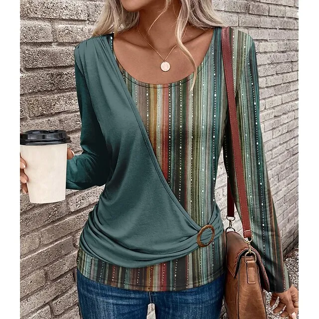 Women's T shirt Tee Striped Daily Weekend Blue Green Khaki Print Long Sleeve Fashion Round Neck Regular Fit Spring & Fall